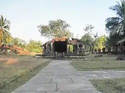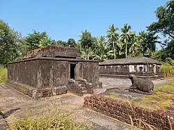 A 20-feet monolithic stone pillar is erected at the entrance.[3] The temples were elegantly designed with carvings and embellishments, but are now in ruins. The twenty-four dents in the stone are the only evidence of the existence of idols of the twenty-four Jain thirthankaras.[10] There are three main structures in a big courtyard with a victory pillar at the entrance. Archaeologists say that they were built between the 8th and 12th century A.D. Built by the Alupa rulers, the Jain Basadi, unlike most South Indian temples built in the Dravidian style, does not have a gopuram. The sanctum sanctorum is surrounded by stone walls otherwise known as Prangan, with sloping stone pillars over it. The original Mahavira idol was destroyed but has been replaced by stone tablets with animal figures that are a later addition.[2]