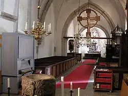 Among the furnishings, the medieval altar (which has probably once housed a relic) has a Baroque top, dated 1683 and with the monogram of King Charles XI of Sweden. The triumphal cross featuring the crucified Jesus is from c. 1240 and is attributed to the anonymous Tingstädemästaren. In the choir, some tombstones from the 13th and 14th centuries are visible, and the pulpit, itself dating from 1673, has been placed on a medieval side altar. The pews and the organ cover are from the 19th century. One of the church bells is from c. 1440 and carries inscriptions evoking Christ, Mary and Saint Dionysius; the latter is believed to have been the patron saint of the church in Catholic times.[1]