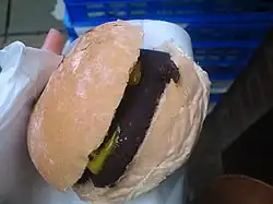 Chips are also a popular filling, sold in most fish and chip shops in the North West of England and often called a chip barm. Another popular filling in the North West, particularly Bolton, is a pasty barm.[6][7] In Wigan, a whole savoury pie is served in a barm cake, traditionally known locally as a “pie barm” or “slappy”. More recently it is known as a "Wigan kebab",[8][9] including on the menu of the local football team Wigan Athletic.[10]