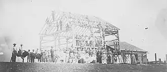 A barn raising, also historically called a raising bee or rearing in the U.K., is an action in which a barn for a resident of a community is built or rebuilt collectively by its members. Barn raising was particularly common in 18th- and 19th-century rural North America. A barn was a necessary structure for any farmer, for example for storage of cereals and hay and keeping of animals. Yet a barn was also a large and costly structure, the assembly of which required more labor than a typical family could provide. Barn raising addressed the need by enlisting members of the community, unpaid, to assist in the building of their neighbors' barns. Because each member could ask others for help, reciprocation could eventually reasonably be presumed for each participant if the need were to arise.