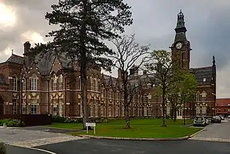 The Barnes Convalescent Hospital was built for the Manchester Royal Infirmary between 1871 and 1875 by Lawrence Booth of the architecture firm of Blackwell, Son and Booth of Bury and Manchester. It is noted for its architectural distinctiveness and as an early example of a purpose-built convalescent hospital. The building was designed on a cruciform plan in the French Gothic Revival style, constructed of red brick and blue brick with ashlar and terracotta dressings, and the roofs are covered with Welsh slate. The building was richly decorated with ornamental brickwork, pointed arched and mullioned windows, decorative ridge tiles. On the western side is the building's main landmark, the tall clock tower, with clock faces on each side and a high two-stage lantern roof topped with an ornamental iron crown. Alterations to the building were carried out in 1893 by Pennington & Bridgen, and again in 1939-45 by Thomas Worthington & Son, both Mancunian architects' firms.[1]
