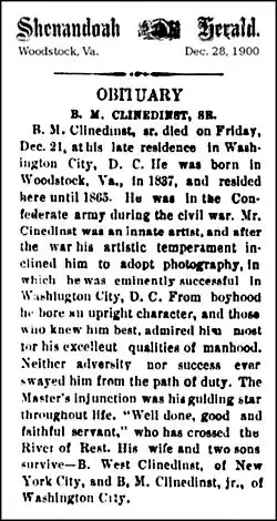 He died on December 21, 1900, in Washington, D.C. He was the father of Barnett McFee Clinedinst, who served as the official White House portrait photographer for the Presidential administrations of Theodore Roosevelt, William Howard Taft, and Woodrow Wilson,[1][2] and Benjamin West Clinedinst, a painter.[4][5]