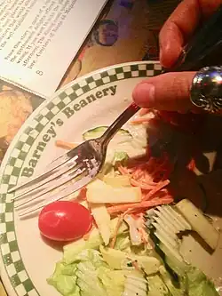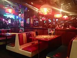 Barney's relocation to West Hollywood, combined with the fact that the owner extended credit and occasionally gave away food, made the bar popular with people of diverse backgrounds, including artists, writers, and other celebrities. Older Hollywood actors such as Clara Bow, Clark Gable, Errol Flynn, Judy Garland and Rita Hayworth were all regulars in their day.[1][3] By the 1960s, the neighboring Sunset Strip had become an important music center, and Jim Morrison (who was reportedly thrown out of Barney's for urinating on the bar)[1][4] and Janis Joplin became regulars (Barney's was the final place Joplin visited before her death in October 1970). Poet Charles Bukowski hung around,[3] as did artists Ed Kienholz and others associated with the Ferus Gallery, which was located nearby on La Cienega Boulevard.[1] Quentin Tarantino also allegedly wrote most of the screenplay for his film Pulp Fiction sitting in his favorite booth at the original Barney's Beanery in West Hollywood.[5] Jon Taffer got his start in the nightclub and bar industry here as a bartender while performing as a drummer in a live band.[6][7]