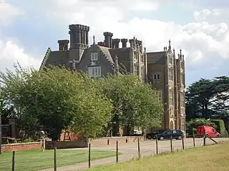 To the north of the hall is the coach house and stable block which are connected to the hall with high brick wall on the west and service building to the east. The stable and coach house are in an L shape and range to the north and the east of the courtyard and are both Grade II listed buildings.[4] The east block which was the stable block has a wooden clock turret with a bell under a leaded cupola over a crow-stepped gabled bay. Either side are this central bay there are smaller crow-stepped gabled bay. The building is built in red Norfolk brick with a tile and pantile (Rear) roof. The northern side building was the coach house and coachman's cottage. The building is over three storeys and has three bays with equal sized crow-stepped gables. With dormers. It is built in red brick with some diaper decorative pattern built into the brick bond. The roof is of plain red tile with fish tail tiles to the front