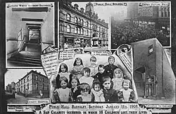 The accident occurred during a penny performance for children at a public hall in Barnsley, West Riding of Yorkshire, on 11 January 1908. Children from across Barnsley had come to watch a film, walking to the public hall through falling snow.[2] According to news reports at the time, a large number of children showed up, and the hall quickly became overcrowded. With the ground floor seats full, children packed into the gallery to such an extent that the aisles of the gallery were filled and children were pressed against the lower gallery railing. In order to relieve some of the crowding, and concerned about the press of bodies against the gallery railing, an attendant in the hall called for some of the children to descend the stairs to the main floor.[3]