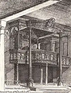 The arms of the Barclays, impaled with those of Crawfurd are carved on a panel located on the tower of the kirk.[34] The Crawfurds added the Crawfurd Aisle to the Auld Kirk with its fine Renaissance-style carvings of 1642.[26] A private apartment is located behind with the family burial vaults lying beneath. The numerous heraldic shields were carved for John, first Viscount Garnock, and represent the armorial bearings of his ancestors.[34]