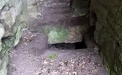 This wing was constructed in 1627 at right angles to the old keep using rubble faced with dressed with sandstone ashlar.[22] A door was broken through from the hall of the old keep to a staircase in the mansion house. The mansion was a fine specimen of 17th-century architecture.[18] It had turrets corbelled out at hall level and these contained closets. The front door was set in an unusual shallow projection and a narrow back door at the north facing aspect led into a courtyard. Two cellars existed with a passage between them that connected with the main staircase.[17] The hall in the old tower may have been used as a dining area and the large room in the mansion house utilised as a drawing-room.[18] The most southerly turret and a large part of mansion house wing fell at some point between 1956 and 1964.[23]