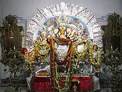 Durga Puja is possibly one of the oldest and the largest organised festivals of Western Bengal. There were numerous household Durga Pujas conducted in various parts of Bengal. Generally, such pujas allowed the general public to worship and the arrangements were taken care by the family who takes the initiative and spends money on it. The Sabarna Roy Choudhury family has been celebrating Durga Puja since 1610 in their ancestral home at Barisha.[6]