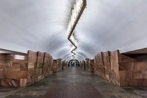 The station was built following a typical pylon design, but due to unfavourable underlying geological conditions the pylons eventually had to be widened. The station architects Strelkov and Polikarpova used pink and red marble in the pylons. The walls use with different shades of pink, red, blue and grey marble. The central hall had to be extended as the station was initially designed for extended seven-carriage trains (although the line has been using eight-carriages since the late 1980s). The entrances to the central hall are all decorated with metallic artworks.[2]