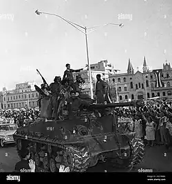 In the late 1950s, the Batista government bought the building and demolished it with the intention of building the headquarters of the National Bank of Cuba.[9] In a speech, Fidel Castro states: "We have always seen a building under construction here. This building (bank building) is an inheritance. We inherited this building at the time of the victory of the revolution. A building for the national bank was being built."[10] However, a photograph published in Havana in January 1959 showing Castro's son Fidelito riding on top of a tank contradicts this statement as the Beneficiensa building can be seen on the left background of the photo.