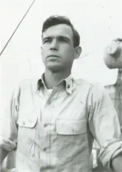 ![]() Barry K. Atkins on the bridge of USS Melvin, 1945 | |