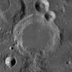 The rim of this crater is worn and eroded, particularly along the southern face and in the northeast where a small crater overlies the rim. The interior floor forms a nearly plain except for a tiny central peak offset to the west of the midpoint, and is marked by a number of tiny craterlets.