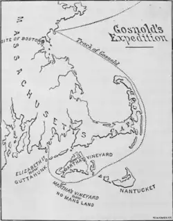 Gosnold graduated from Jesus College at the University of Cambridge and studied law at the Middle Temple.[3] It was probably at Cambridge that he met John Brereton, a friend who accompanied him on his 1602 voyage to New England, becoming the first Englishmen to land on that coastline. He was also a friend of Richard Hakluyt and sailed with Walter Raleigh. He married Mary Goldinge, daughter of Robert Goldinge of Bury St Edmunds and his wife Martha Judd, at Latton, Essex, in 1595. Mary's mother, Martha, was daughter of Sir Andrew Judd a wealthy London merchant who, among other offices, was Lord Mayor of London, 1550–51. More importantly for Gosnold's story, Sir Andrew Judd was also grandfather to Thomas Smith, one of the founders of the Virginia Company.[9] "Bartholomew's marriage, which has the appearance of one arranged with foresight, brought together a young man of high standing among the landed gentry and a young lady whose antecedents were found chiefly among the wealthier merchants of the city of London."[10] Together, Bartholomew and Mary Gosnold had seven children, six of whom were baptized at Bury St Edmunds, Suffolk, between 1597 and 1607:[11]