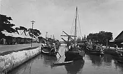 In 1739, the Dutch East Indies government under Governor General Van Imhoff built Oosterslokkan ("Eastern Canal") for irrigation and transportation of goods from inland. The canal was completed 14 years later, in 1753, but the effort to use it as a transportation way failed due to many leaks and the high cost of building multiple water gates. Finally, it is used only for irrigation.[7] There were three water gates to water the rice fields in the upstream areas of Ratim, Cibalok, and Cibanon. The water debit increased with the establishment of Katulampa Dam in Buitenzorg (Bogor) in 1749. The canal also supplied water to 9,075-hectare rice fields on the eastern side of Ci Liwung.[7]