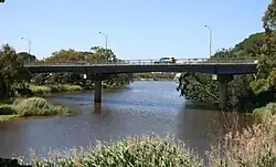 A low-level road causeway was built across the breakwater by the Country Roads Board in the mid-1960s.[18] The causeway had a restricted 3.7-metre (12 ft) clearance underneath the railway bridge, and was only about a metre (3 ft) above the water level. As a consequence, a number of trucks became stuck under the railway bridge, and the causeway also required frequent closure due to river flooding. To overcome those problems, VicRoads received planning permission in 2009 to replace the low-level crossing with a new bridge about 350m upstream, at a cost of $63 million, which was completed in mid-2012.[35]