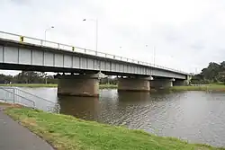 The four-lane Barwon Bridge carries Moorabool Street over the river, and is located on the site of the first Barwon crossing. The first wooden bridge opened early in 1848. Tolled by the South Barwon council, it was swept away in a flood four years later, on 23 May 1852. From December that year a government punt operated at the site. By late 1853, two government punts were used to form a pontoon bridge.[27] It was not until 1859 that a proper iron bridge was opened as a replacement. That bridge was only two lanes wide and was considered too narrow to permit the extension of trams into Belmont, so it was closed and dismantled in 1924.