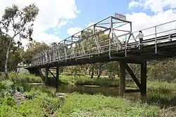 The original bridge, consisting of four bluestone piers supporting a timber superstructure, was constructed in the 1850s. Reconstruction of the bridge began in the 1910s, which replaced the timber superstructure with a new structure made of iron and steel, but retained the original bluestone piers.[20] The reconstructed bridge was opened on 14 February 1921 by Victorian Premier Harry Lawson.[21]