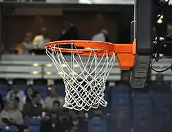 The basket or hoop is a piece of basketball equipment, consisting of the rim and net. It hangs from the backboard. The first basket was a peach basket installed by James Naismith.[1] The bottom was eventually cut out of the basket, and the basket was eventually replaced with the metal rim and net.[2][3] Today there are breakaway rims.