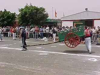 The "oxcart game" is a display of strength. Contestants have to lift the back of an ox cart, usually weighing around 360 kg (790 lb), and the end usually at around 40 cm (16 in) above the ground. The cart is pivoted to the ground at the front end and competitors must rotate it, trying to go around as many times as possible in a sideways motion.