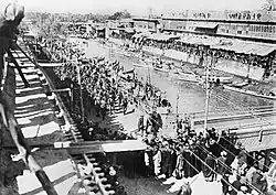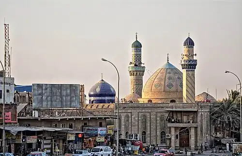 The city was founded at the beginning of the Islamic era in 636 and began as a garrison encampment for Arab tribesmen constituting the armies of the Rashidun Caliph Umar.[6] A tell a few kilometers south of the present city still marks the original site which was a military site.[7] While defeating the forces of the Sassanid Empire there, the Muslim commander Utbah ibn Ghazwan erected his camp on the site of an old Persian military settlement called Vaheštābād Ardašīr, which was destroyed by the Arabs.[8][9] While the name Al-Basrah in Arabic can mean "the overwatch", other sources claim that the name actually originates from the Persian word Bas-rāh or Bassorāh, meaning "where many ways come together".[10]