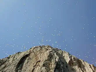 The island plays host to more than 150,000 northern gannets and is the world's largest colony of the species. Described famously by naturalists as "one of the wildlife wonders of the world" (often credited to David Attenborough),[41] it was also awarded BBC Countryfile magazine's Nature Reserve of the Year, following a nomination by Chris Packham, in 2014/15. When viewed from the mainland, large regions of the surface appear white owing to the sheer number of birds (and their droppings, which give off 152,000 kg of ammonia per year, equivalent to the achievements of 10 million broilers).[42] In fact the scientific name for the northern gannet, Morus bassanus, derives from the rock. It was known traditionally in Scots as a "solan goose". As on other gannetries, such as St Kilda, the birds were harvested for their eggs and the flesh of their young chicks, which were considered delicacies. It is estimated that in 1850 almost 2,000 birds were harvested from the rock. Other bird species that frequent the rock include guillemot, razorbill, shag, puffin, eider and numerous gulls.[43]