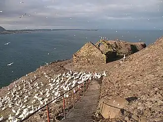 The natural history of the rock was written about in John Mair's De Gestis Scotorum ("The deeds of the Scots"), published in 1521.[44] Today, the Scottish Seabird Centre at North Berwick has solar-powered cameras located on the island which beam back live close-up images of the seabirds to large screens on the mainland, just over a mile away. The images are sharp enough for visitors at the Seabird Centre to read the ID rings on birds' feet.[45] The Seabird Centre has a range of cameras located on the islands of the Forth and also broadcasts the images live on the internet.[46] The centre also has exclusive landing rights to the island from the owner Hew Hamilton-Dalrymple and operates a range of boat trips going around, and landing on, the island throughout the year, weather permitting.[47]