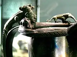 The flagons are richly decorated with glass and coral inlays and a range of animals on the lid. Time has faded the coral but the pieces would have been brightly coloured. The handle is formed as a dog, terminating at the bottom with a human face. The idea of a dog or other animal for a handle comes from Greek and Etruscan culture,[2] as does the motif of two crouching animals lying around the rim, as well as the head at the bottom of the handle. The duck on the spout is a Celtic addition to the scheme. The eyes of the duck and the dogs have been finished by using a complex drill bit[7] and they were drilled by the same person.[8] Both vessels measure just over 40 cm in height. The drinking vessels were found with a pair of Etruscan bronze stamnoi or vessels for wine-mixing that date from the same period (also now in the British Museum).[9]