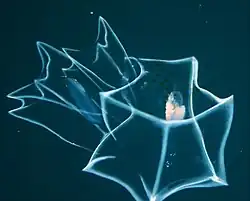 The species reaches body lengths of 6–8 cm. The body plan is radially symmetric around a central mouth, with a polyhedral shape bearing 4 main ridges which end in short basal teeth. The species is bioluminescent and has a bluish tint on the ridges of the nectophores and is covered in gelatinous sheets that form a "box" around the mouth.[6] As in all cnidarians, there is a single gastrovascular cavity (the coelenteron) and the mouth acts as both mouth and anus; it is surrounded by a layer of tentacles bearing nematocysts.[7]