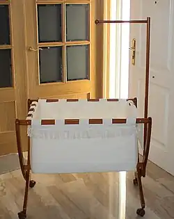 On many long-haul flights, most airlines provide a bassinet (which is attached to a bulkhead) to adults travelling with an infant, i.e., a child under the age of two. The use of the bassinet is restricted by the infant's size and weight.[3] These need to be requested in advance with the airline. However, most USA and Canadian airlines have bassinet policies which mean they are only allocated at the airport gate.[4][5][6]