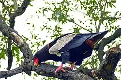 It is uncommon-to-rare but not unprecedented that bateleurs may prey on other raptors.[7][111] Bateleurs have been documented preying on black-winged kites (Elanus caeruleus), wintering lesser spotted eagles (Clanga pomarina), gabar goshawks (Micronisus gabar), barn owls (Tyto alba), spotted eagle-owls (Bubo africanus) and peregrine falcons (Falco peregrinus).[79][84][94][112] Additionally, they were considered a likely potential predator upon nestlings of the white-backed vulture.[113] Certainly the most impressive instance of intraguild predation documented as committed by bateleurs is when one was seen killing an adult Verreaux's eagle owl (Bubo lacteus), a formidable top predator among owls and possibly the largest avian prey ever reported for a bateleur.[7][114] The predators of mature bateleurs themselves are not well-documented and in fact, Verreaux's eagle owls may the only species verified to repeatedly prey upon bateleurs, but this is probably due to rare predator identification at bateleur nests.[115][116] Bateleurs are usually considered apex predators.[117] By contrast, bateleur nestlings are vulnerable to predation compared to other raptors. Though adult bateleurs can simply leave the nest or crouch below the nest rim to reduce nest detectability to many predators, they can be very aggressive toward conspecifics as well as other raptors, and occasionally human intruders. However, due to their unique foraging mode which takes them far from the nest for long periods of the day, the physical defense is largely unable. Thus, chicks are presumed to be vulnerable to a huge range of predators although very few are properly identified. Based on other eagles in Africa, these are likely to include various sizes of mammalian carnivores, snakes, monitors and various birds of prey, including even perhaps much smaller species and vultures due to the long periods bateleur eaglets are left unprotected.[8][34][103][118]