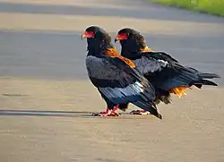 Bateleurs may encounter a huge range of other scavengers when coming to carrion. Most clearly vultures are often present at carrion. However, due to their smaller size, the tawny eagle and especially the bateleur can begin foraging for carrion earlier in the morning, while the vultures must wait for updrafts to undertake flight.[104][105] Bateleurs in particular are considered most likely to find a carcass first before other scavengers.[105][106] This was verified in a study in Maasai Mara where it was additionally found that scavengers kept to body size in terms of hierarchy. The descending order of scavenger dominance was stated to rank starting with the spotted hyenas (Crocuta croctua) at the top and black-backed jackals and feral dogs (Canis lupus familiaris), then the lappet-faced vulture (Torgos tracheliotos), the Rüppell's vulture (Gyps rueppellii), followed by all other vultures with the tawny eagle and the bateleur in the second most and the most subordinate scavenger positions.[107] Therefore, the bateleur is considered a scavenger with high search efficiency but low competitive ability.[105][106][107][108] However, the bateleur does benefit from the larger scavengers, being less able to access a large carcass, at best feeding on the eyes of said carcass unless it is already otherwise torn asunder such as large carnivore prey or roadkills.[13][106] With the epidemic-level reduction of vultures in Africa, it was found in Maasai Mara that both bateleurs and tawny eagles have been found to actually increase in sighting frequency in sync with the vanishing numbers of remaining vultures, with the number of bateleur sightings increasing by 52%.[109] To the contrary of the expected hierarchy, cases are known where bateleurs have attacked and dominated much larger scavenging birds including white-backed vultures (Gyps africanus) and bearded vulures (Gypaetus barbatus), with these having been successfully displaced or lost carrion to a bateleur.[10][6] Even more impressively, cases where bateleurs interacting with much larger, more powerful martial eagles have involved instances where the bateleurs have attacked, pirated and even brought to ground in clashes that appear to end in a drawl. However, the martial eagle occupies a notably higher trophic level than the bateleurs and is not considered subservient to bateleurs due its even greater predatory prowess.[7][34][79] Similarly, instances of considerable competition have been reported between bateleurs and African fish eagles (Haliaeetus vocifer), which are similarly prone to opportunistic piracy and aggressive interspecific relations. However, the two species are partitioned by habitat and primary prey.[110]