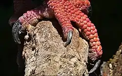 The bateleur evidences some sexual dimorphism in favour of the female as is expected in raptorial birds but this size difference is fairly minimal relative to many other accipitrids, averaging up to about 6%.[5] Among standard measurements, males have a wing chord length of 476 to 553 mm (18.7 to 21.8 in) while that of the female is 530 to 559 mm (20.9 to 22.0 in). In tail length, adult males measure 98 to 124 mm (3.9 to 4.9 in) and can be even shorter in adult females at 105 to 113 mm (4.1 to 4.4 in), in some cases the adult's tail may reportedly measure as short as 72 mm (2.8 in). This contrasts with the tail of juvenile bateleurs which measures 142 to 172 mm (5.6 to 6.8 in). The tarsus can measure from 67 to 75 mm (2.6 to 3.0 in) in males and 72 to 75 mm (2.8 to 3.0 in) in females. Unsexed adult bateleurs in Tsavo East National Park were found to average 513 mm (20.2 in) in wing chord length, 34.5 mm (1.36 in) with a range of 28.6 to 38 mm (1.13 to 1.50 in) in culmen length and a relatively small hind claw length of 30.6 mm (1.20 in). While the hind or hallux claw is usually the most enlarged in most species of accipitrid, on the other hand in the Tsavo East bateleurs, unusually the middle claw on the front of the foot was slightly larger at 32 mm (1.3 in). Notably the proportions of bateleurs are similar to snake eagles with robust feet with rough, thick skin and short talons, the bateleur in particular having very thick, large toes structurally almost like those of a big owl and very sharp talons reminiscent in sharpness of highly predaceous larger African raptors. Further like snake eagles, bateleurs have a rather large headed but with a smallish beak coupled with a large gape. These adaptations generally equip the subfamily to better handle and ingest snakes relative to other accipitrids.[5][33][34][35]