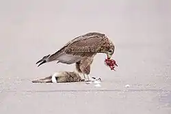 Outside of galagos, among primate foods most monkeys observed in the diet such as baboons and vervet monkeys (Chlorocebus pygerythrus) are thought to be largely scavenged as carrion.[79][80] However, studies of king colobus (Colobus polykomos) and Angola colobus (Colobus angolensis) in Central and southeastern Africa (both where few details are known of bateleurs' diets), it was mentioned bateleurs may be a potential predator of troops based on the anti-predator activity and vocalizations of these species provoked by bateleurs.[90][91] The bateleur, using its large, powerful feet, does not shy away from very large prey and has been known to regularly kill mammals heavier than itself including scrub hare estimated to weigh 2,600 g (5.7 lb), springhares estimated to weigh 3,000 g (6.6 lb), Cape hyrax estimated to weigh 3,800 g (8.4 lb), Kirk's dik diks estimated to weigh 4,000 g (8.8 lb) and greater cane rats estimated to weigh 4,500 g (9.9 lb).[33][79] Even more impressive mammalian kills have been suspected, with instances where reportedly adults black-backed jackals (Canis mesomelas), honey badgers (Mellivora capensis), and aardwolf (Protelas cristatus), any of which may weigh around twice the aforementioned large mammal prey for bateleurs, may have been unexpectedly killed by bateleurs.[13][33][80] Furthermore, an instance of attempted predation in Tanzania on an adult honey badger was witnessed, ending with both the bateleur and badger dying from the ensuing fight.[92]