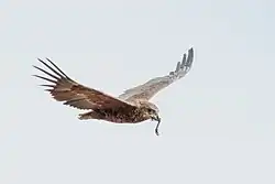 Bateleurs forage almost entirely based on opportunity and have no particular specialization on any particular prey type.[7] As a result, a wide prey spectrum has been reported, with around 160 prey species known, they thus rival martial eagles (Polemaetus bellicosus) and perhaps just slightly behind tawny eagles (Aquila rapax) as the most diversified feeder known among African eagles.[7][6][33][79] Among their prey, mammals, birds and reptiles, roughly in that order, seem to be considerably preferred over other prey taxa.[7][79] Based on morphology, their long middle toes have been cited as an indication that they originally diversified to become a bird-eater but a rather small degree of sexual dimorphism between males and females indicates a preference for mammal eating.[5][81][82] By the most complete picture of the bateleurs diet was a compilation study that compiled 1879 prey items from differing parts of the range.[79] In it was found that bateleurs derived 54.6% of the diet from mammals, with perhaps two-thirds to about half of the diet being mammalian carrion, along with 23.7% of the diet being from birds, 17.8% from reptiles, 1.9% from fish, 1.8% from invertebrates and an extremely small amount (about 0.2%) of amphibian food.[79] Predominantly, within the compilation study, preys were unidentified to species, with 58.4% of the carrion sources, 26.9% of live mammals, genera, or families, and 22.2% of birds unidentified to species.[79]