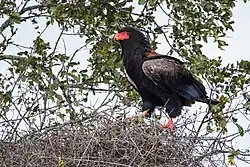 Nests are located in fairly large trees, sometimes near a watercourse, either in hilly terrain or open flat country. At times, bateleurs are adaptable and perhaps even favor towards nesting near manmade openings such as roads or paths.[5][10][7] Nests are typically at 10 to 15 m (33 to 49 ft) above the ground but in extreme may be from 7 to 25 m (23 to 82 ft) high.[5][7] The nest is normally within the canopy in the fork of the main trunk or a large lateral branch so that it is shaded for much of the day.[7][54] A variety of tree species may be used. In southern Africa, favored trees tend to Adansonia and especially Acacia trees. Senegalia nigrescens trees may too be popular.[7][54][67] Bateleurs usually nest on structures made by themselves but one nest was reported in on a buffalo weaver nest and was difficult to observe.[7] Furthermore, old nest of other birds may be used, in one case a Wahlberg's eagle (Hieraaetus wahlbergi) nest taken over and added to deepen it.[7] The nest is a solid structure of medium-sized sticks, measuring about 60 cm (24 in) across, 30 cm (12 in) deep with a leafy cup of about 25 cm (9.8 in) across. Snake eagles and their kin tend to build relatively small if bulky nests relative to their size and the bateleur is no exception, with their nest size being about half that of in diameter of a similarly-sized eagle like the tawny eagle.[5][7][85] Nests tend to be lined with green leaves by the bateleur pair.[5] Both sexes of bateleur are known to contribute to the building or repair of a nest, a process that typically takes about 1–2 months, though sometimes nest construction can be reportedly protracted even in years where no breeding occurs.[7] They often subsequently use a new nest in the same general area in consecutive breeding seasons, usually not more than 1 to 3 km (0.62 to 1.86 mi) away, and may reuse a nest they built previously. There is much variation in this regard, from 1 nest being used in 5 consecutive years to no nest reusage in 3 recorded years.[7] Nests built by bateleurs tend to be favored by lanner falcons (Falco biarmicus), probably in part because the eagle's young are fledged by July–August when lanners tend to lay; however 1 nestling was persistently mobbed by a lanner during its last week at the nest.[7] In ranching country in Zimbabwe, nests are spaced 13 to 16 km (8.1 to 9.9 mi) apart.[7] In Mozambique, nesting spacing was found to be about 5 km (3.1 mi).[123]
