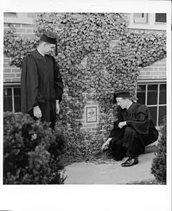 The class graduates participate in an Ivy Day which installs a granite Ivy Stone onto one of the academic or residential buildings on campus.[20] They serve as a symbol of the class and their respective history both academically and socially. Some classes donate to the college, in the form gates, facades, and door outlines, by inscribing or creating their own version of symbolic icons of the college's seal or other prominent insignia. This usually occurs on graduation day, but may occur on later dates with alumni returning to the campus. This tradition is shared with the University of Pennsylvania and Princeton University. On Ivy Day, members of Phi Beta Kappa are announced.[21]