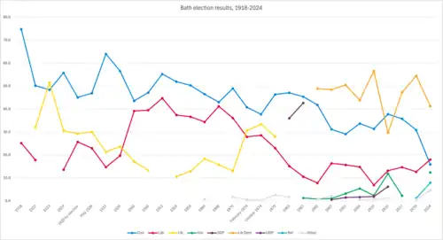The Liberal revival in the 1970s saw the two more left-wing parties swap places, helped by the adoption of a nationally known candidate, Christopher Mayhew, who had defected from the Labour Party.[15] The formation of the SDP–Liberal Alliance made Bath a realistic target. The SDP came 1500 votes from winning in 1987 under Malcolm Dean. In 1992, Conservative Chris Patten was ousted by Liberal Democrat Don Foster in a narrow defeat widely blamed on Patten's strategising, campaign leading and communicating as Conservative Party chairman rather than canvassing his own constituents.[16] At each election from 1992 to 2015, a different Conservative candidate contested the constituency.