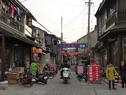 A small lane in Yangzhou's old city, with a sign across the street advertising "3 yuan men's and women's public showers" (三元男女浴室) and a chess room
