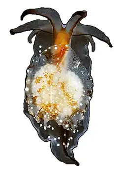 The reproductive system is hermaphroditic and monaulic. The ovotestis forms an incomplete ring around the sides of the large digestive gland. The ampulla is large and tube-shaped.[1]