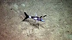 - ^ a b c d e f g h i j k l m n Davis, Matthew P.; Chakrabarty, Prosanta (April 2011). "Tripodfish (Aulopiformes: Bathypterois ) locomotion and landing behaviour from video observation at bathypelagic depths in the Campos Basin of Brazil". Marine Biology Research. 7 (3): 297–303. Bibcode:2011MBioR...7..297D. doi:10.1080/17451000.2010.515231. S2CID 84354865.