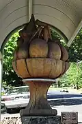 Carved by Fred Alwahan from the trunk of a red oak on Mayday Road, Batlow, NSW in 1994,[15] it stands over two metres tall. The plaque (inset) informs that Alwahan donated the work as a tribute to the town's pioneers.