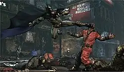 Using an improved version of the "Freeflow" combat system from Arkham Asylum, the player can now counter multiple blows simultaneously, catch hurled projectiles, attack aerially, and administer a succession of consecutive strikes. Many of Batman's gadgets can now be used in combat.[16] Enemies are armed with varying levels of armor and weapons; attacks from basic weapons like baseball bats and lead pipes inflict minor damage and can be countered, while guns inflict significant damage. Certain enemies must be disarmed in specific ways before they can be neutralized in combat: enemies with stun batons can only be attacked from behind; enemies with shields require aerial attacks to disarm; and enemies wearing body armor must be stunned with rapid successive strikes before they can be harmed.[19][20] Larger enemies must be tackled with stuns and combo attacks, and can be manipulated to take out their allies.[21] Disputes between gangs allied to rival villains often spark turf wars, which complicate the player's ability to move about Arkham City.[16] Combat, among other actions, rewards the player with experience points that allow the player to periodically level Batman up and purchase upgrades to his Batsuit, gadgets, and combat and stealth skills. Each category contains approximately 15 different upgrades. For instance, an upgraded grapnel gun can be used to remotely disarm enemies, while a combat upgrade makes it easier to activate special attacks.[22][23]