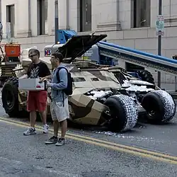 Production photos from filming in Pittsburgh showed a second Tumbler chassis after the first was destroyed, indicating that a new Batmobile would be in the film, following the destruction of the first in The Dark Knight.[116] Further set photos revealed a "new vehicle" being transported to Wabash Tunnel, prompting speculation as to its nature.[117] In June 2011, Autoblog confirmed the presence of the new Lamborghini Aventador on the film set.[118]