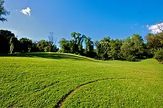 Battery Kemble was completed during the Autumn of 1861, as part of the Civil War Defenses of Washington, also known as the Fort Circle. It was named after Gouverneur Kemble of Cold Spring, New York, former superintendent of West Point Foundry, where most of the heavy Army and Navy guns were made during the Civil War.[3] Battery Kemble is on the high point of land, 387 feet (118 m) above mean low level of the Potomac River, where its guns could protect both Chain Bridge and Aqueduct Bridge. The artillery had "an extreme range of 3 miles, while it is under the direct fire, to a distance of at least 1,000 yards of the works."[4] The earthwork remains of the battery are distinct and well preserved.[5]