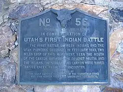 The Battle Creek massacre was a lynching of a Timpanogos group on March 5, 1849, by a group of 35 Mormon settlers at Battle Creek Canyon near modern Pleasant Grove, Utah.[1] Four were killed.[2] It was the first violent engagement between the settlers who had begun coming to the area two years before, and was in response to reported cattle theft by the group. The attacked group (led by Kone Roman Nose) was outnumbered, outgunned, and had little defense against the militia that crept in and surrounded their camp before dawn.[3][4] The massacre had been ordered by Brigham Young, the Utah territory governor and president of the Church of Jesus Christ of Latter-day Saints (LDS Church).[5] The formation of the Mormon settlement of Utah Valley soon followed the attack at Battle Creek.[6] One of the young survivors from the group of 17 children, women, and men who had been attacked grew up to be Antonga Black Hawk, a Timpanogos leader in the Black Hawk War (1865–1872).