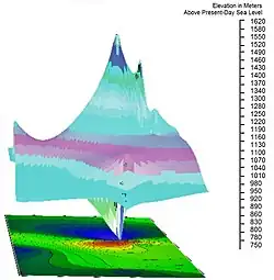 A unique geological feature of Battle Mountain is that the western slope outcrops are composed entirely of alkali feldspar granite, while the eastern slope up to and including the summit is entirely rhyolitic. This provides strong evidence of a theorized lateral explosive eruption event centered on the eastern slope at approximately 704 Ma as proposed by Woolman (2016). Further mathematical geology evidence which supports this theory includes a palaeogeographic reconstruction of the mountain by Woolman utilizing artificial neural networks and Markov chain geostatistical models including period climate condition-based soil erosion rates, Kirkby's hillslope movement evolution equations and recursive biogeochemical soil erosion rates in felsic granitic conditions. The result was the digital reconstruction image shown on the left, indicating what Battle Mountain may have looked like 704 million years ago on the western slope.