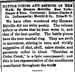 The book had sold only 486 copies by 1868 and recovered barely half of its publications costs and critics at the time were at best respectful and often sharply critical of Melville's unorthodox style.[1] The critical opinion on Battle-Pieces did not change until the latter half of the 20th century, when scholars began to re-evaluate it as worthy of praise and attention.[2]