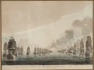 The Swedish battlefleet had spent the winter at Karlskrona and was struck by relapsing fever epidemic during the stay. The epidemic had started from the capture of the Russian ship of the line Vladislav during the Battle of Hogland in 1788. From the captured sailors the disease had spread widely through the fleet during its prolonged stay at Sveaborg in 1788 and was carried with the fleet to Karlskrona later that year.[3] Fitting ships for the sealing season proceeded very slowly and was greatly hindered by the losses suffered due to the illness to the crews. From December 1788 to September 1789 a total of 26,249 were treated for sickness in naval hospitals at Karlskrona alone of whom 5,286 perished while the total death toll of the epidemics is assumed to be around 15,000 lives.[4] By the end of June thousands of infantrymen had to be sent as reinforcements for the fleet. Regardless of the obstacles Admiral Otto Henrik Nordenskiöld who was responsible for refitting was able to ready a fleet of 21 ships of the line and 8 frigates for sailing by 6 June albeit without crews.[5]