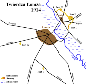 Among the most important positions in the region was a fortified bridgehead of Łomża, the so-called Łomża Fortress. The position, consisting of three large forts in Piątnica (Forts I, II and III), on the northern side of the Narew, and two additional isolated forts (Fort IV and V) on the southern bank, was constructed by Imperial Russian Army between 1896 and 1914. Although outdated and unsuitable for modern warfare, the forts in Piątnica were upgraded with trenches, barbed wire obstacles, chevaux de frise and 12 reinforced concrete bunkers in 1939.[3] Similarly the southern bank around Łomża was reinforced with 9 more bunkers, though shortly before the war their machine guns were moved to Piątnica.[4] The forts were manned by 1st Battalion of the 33rd Infantry Regiment (under Maj. Stanisław Wyderko), part of 18th Infantry Division.[3] The machine gun bunkers were manned by 1st MG Company, 1st Battalion, 42nd Infantry Regiment under Lt. Franciszek Zaręba while the trenches around them were manned by two rifle companies of the 33rd regiment.[3] The frontal positions were supported by 1st platoon of 33rd regiment's anti-tank company (under Lt. Zygmunt Olkowski) and a platoon of outdated 76 mm wz. 1902 guns.[3] The southern side of the river was manned by 3rd Rifle Company, 1st Battalion, 33rd Regiment (under Lt. Aleksander Siejak), supported by 3rd battalion, 18th Light Artillery Regiment (under Capt Stanisław Krug) and a howitzer detachment of 18th Heavy Artillery Regiment (Lt. Col. Władysław Brzozowski).[4]