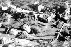![]() Japanese soldiers, killed while assaulting US positions, lie dead on the sandbar at the mouth of Alligator Creek. These troops most likely belong to the ad-hoc unit of volunteers who survived the previous attacks, christened as the 'Sea Riding Unit', ordered to attempt to outflank the US positions by wading through the ocean at about 0530. | |||||||